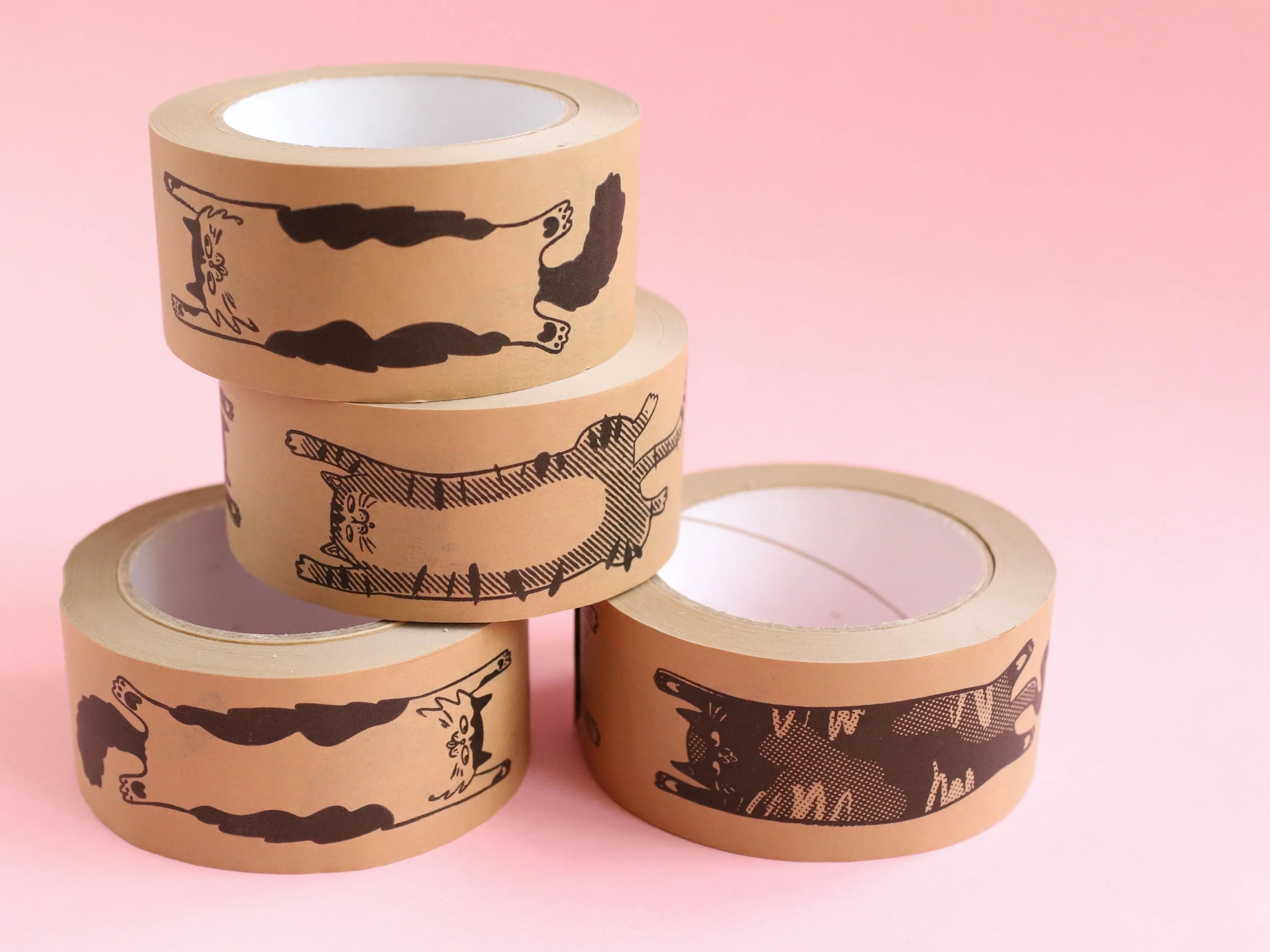 Our kraft paper tape is 50mm wide and decorated with three cheeky kitty cats having a BIG stretch. The tummies of the tabby and tuxedo cats are perfect for adding names or special instructions to parcels and gifts!