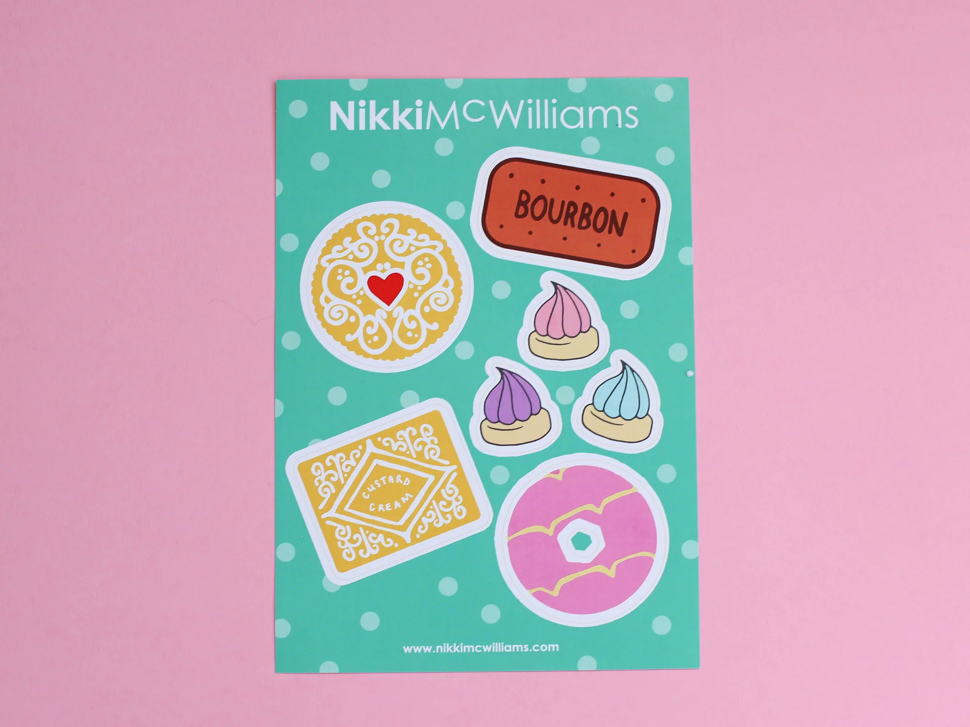 Every sticker sheet contains 7 biscuit stickers in Nikki's signature style including a Custard Cream, Bourbon, Jammy Heart, Party Ring and three sweet little Iced Gems!
