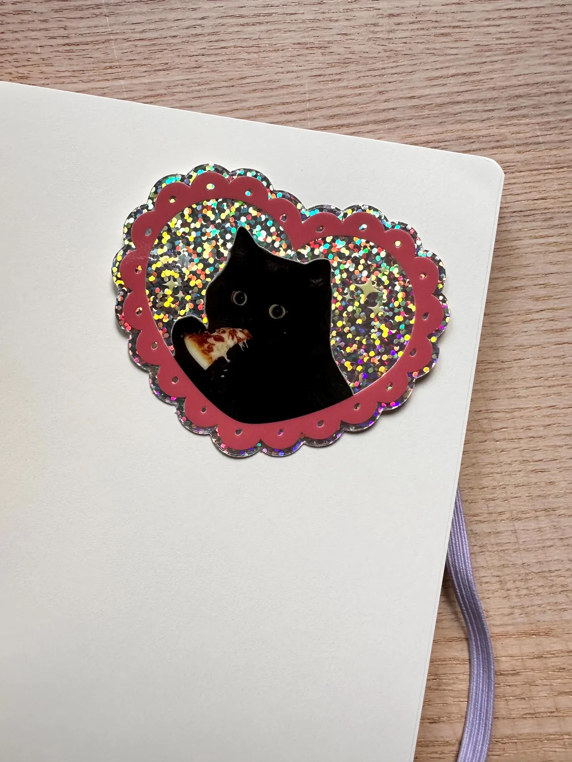 It features a black cat enjoying a slice of pepperoni pizza in a pink scalloped heart frame. Printed on waterproof vinyl with silver glitter dust effect which sparkles rainbow colours in the sun!